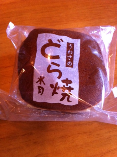 こんな感じで上から見ると普通のどら焼きです。“うわさの”と書いてあります。